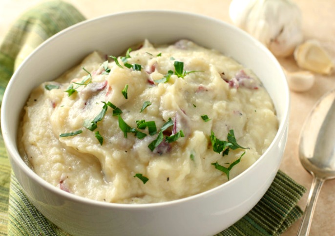 2. Once the water is boiling, add the peeled garlic and the potatoes and bring the water back to boiling. Reduce heat to a simmer and cook for 7-10 minutes or until the potatoes are fork tender but not falling apart. Using a slotted spoon, scoop out the potatoes and place them in a colander over a bowl to catch any residual water. Remove the garlic cloves and set aside. Bring the water back to a boil, then place the brussels sprouts in boiling water. While they are cooking, fill a large bowl with water and a tray of ice cubes. Cook the brussels sprouts for 5 minutes or until they are tender crisp then scoop out and dunk them into the ice water to shock them.
